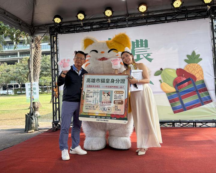 高市農業局神農市集3月28日在凹子底森林公園舉行,主題定為『貓皇「植」民計畫』,規劃限量免費犬貓植入晶片與施打狂犬病疫苗、義診、浪浪認養及犬貓美容教學、寵物精品與優質農產展售等專區,農業局長姚志旺、動物保護處處長許銘彰戴上貓耳髮圈及貓掌手套化身喵星守護者,宣布115年定為寵物貓登記元年,姚志旺也頒狀感謝民間團體配合送養、絕育、偏鄉義診等政策。圖/農業局提供、文/高培德