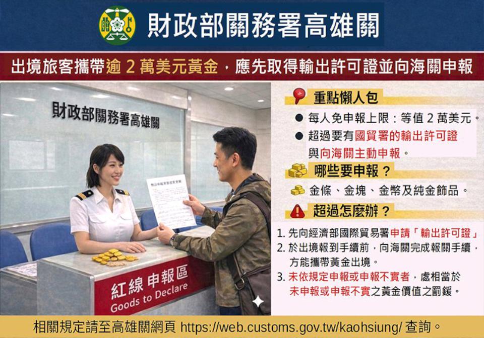 高雄關提醒攜逾2萬美元黃金出境 事先申請國貿署許可主動通報加速通關
