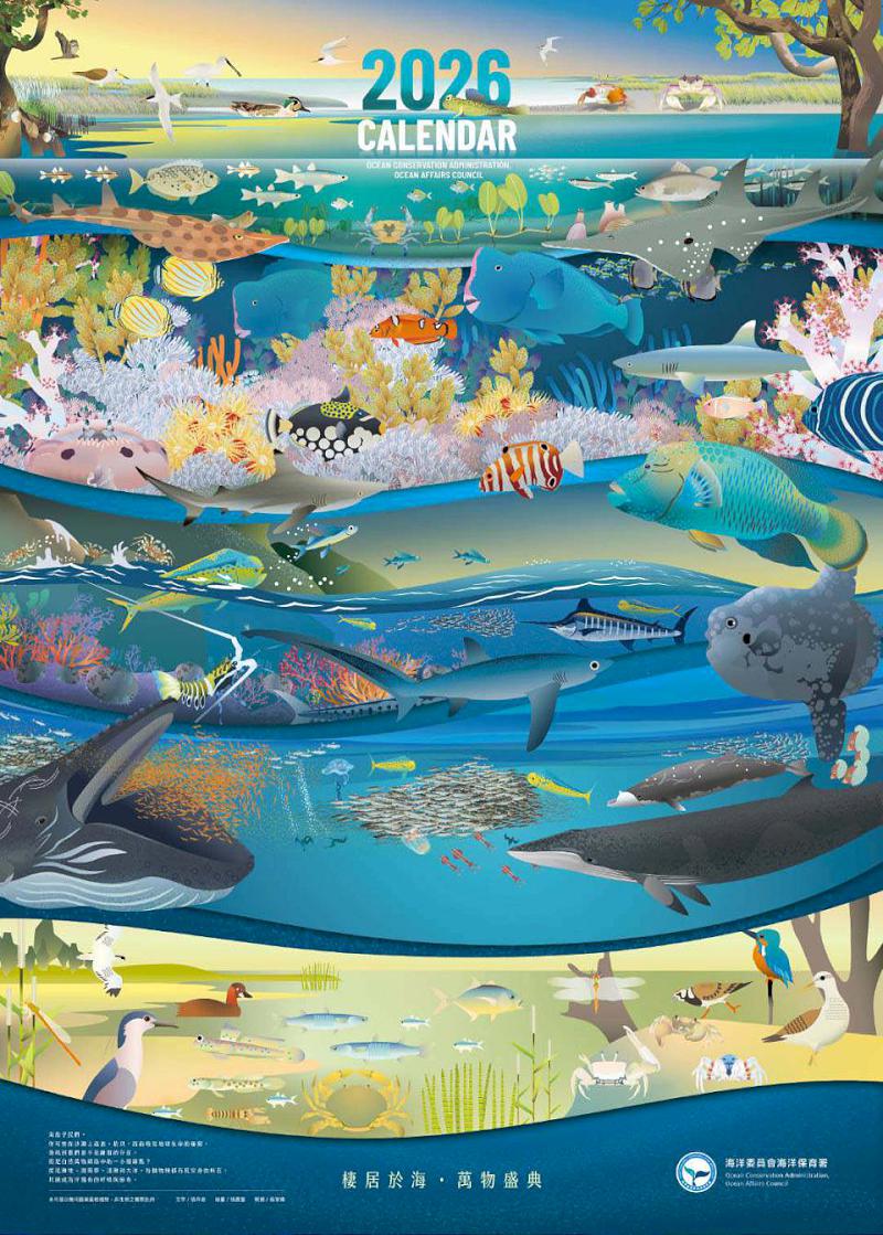 海洋委員會海洋保育署新推2026年年曆《棲居於海・萬物盛典》,從海洋生物多樣性視角,描繪泥灘地、潮間帶、淺灘及浩瀚大洋12種棲地樣貌,即日起上架指定網路書店開放預定。