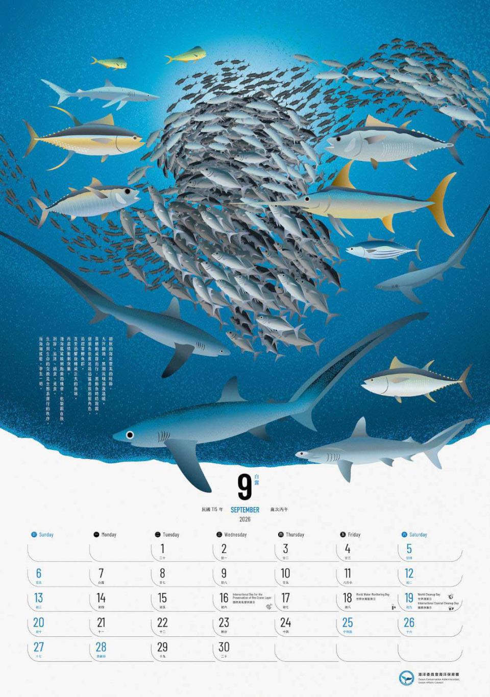 年曆商請海洋文化作家張卉君撰寫詩詞,並攜手插畫家描繪台灣12處海洋棲地生態樣貌,並透過各月份串連四季海洋生態,內容涵蓋珊瑚群中隆頭鸚哥魚與蝴蝶魚落共舞身影、鯨鯊與大翅鯨夏季優游海域、三棘鱟秋季蟄伏潮間帶泥地、黑面琵鷺入冬尋覓獵物等。