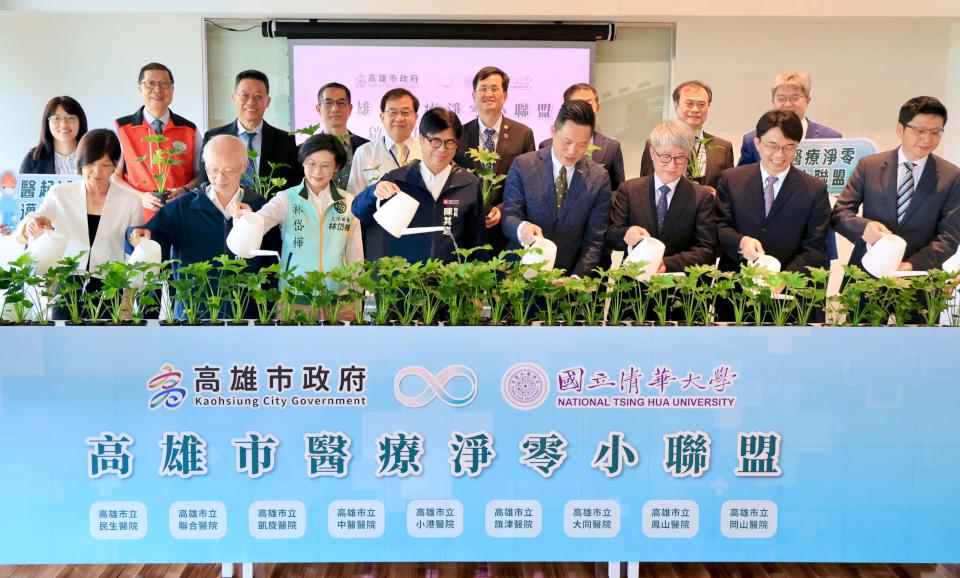高雄市長陳其邁(圖前排右二)、國立清華大學副校長嚴大任(圖前排左四)、國立清華大學永續學院院長范建得(圖前排左三)、臺灣碳權交易所總經理田建中(圖前排左二)、中國信託商業銀行法金高雄區域中心副總沈威光(圖前排左一)、立委林岱樺(圖前排右一)等人7月16日齊聚淨零學院教灌綠色盆栽,歡喜宣布高市衛生局攜手環保局領先全台縣市跨部門推動醫療淨零小聯盟正式成軍,邀請國立清華大學擔任專業顧問團,期能整合跨單位資源,導入專業顧問經驗,初期推動市立醫院自主減量及抵換專案,展現邁入淨零碳排城市決心。