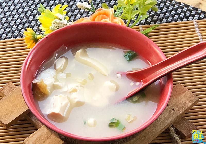 佛心價10元!滑順細緻的嫩豆腐,熬煮出甘甜的味增湯,加入柴魚片及蔥花讓湯品更添風味。