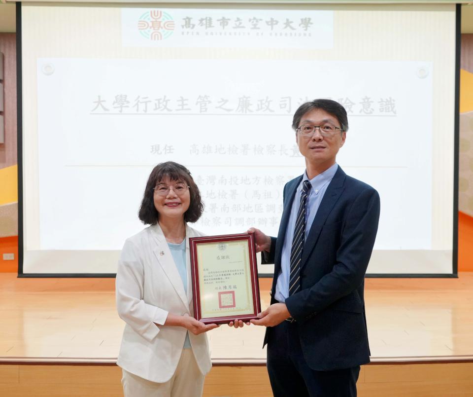 高雄地檢署檢察長黃元冠(圖一)6月26日受邀高市空中大學專講「大學主管之廉政司法風險觀念」,舉實例剖析《貪污治罪條例》、《公務員廉政倫理規範》及《公職人員利益衝突迴避法》等相關法規,同時說明常見缺失及違法樣態,也介紹推動柔性司法創新作為,高市空大校長陳月端(圖二左)代表頒贈感謝狀,陳月端說,國際透明組織2024年清廉印象指數(CPI)評比全球180個國家及地區,台灣排名第25,凸顯清廉接軌國際及廉政成果獲得肯定,學校113年11結盟15個民間單位、司法團體成立柔性司法專班,配合合作單位相關課程對接高等教育。