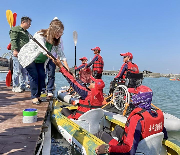 海洋委員會攜手水中運動協會11月16日合辦「勇敢逐浪、無礙前行」無障礙親海體驗活動在高市彌陀漁港海岸光廊舉行,海委會主委管碧玲、高市海洋局長石慶豐、運動發展局長侯尊堯、彌陀區長陳景星、永安區長黃瑞財、彌陀區漁會總幹事林子清、高雄特殊教育學校校長陸奕身、中華民國水中運動協會理事長劉文宏、中華民國身心障礙者休閒運動推廣協會理事長劉耀台、營運長呂嘉儀、國立高雄科技大學副教授丁國桓等人傳遞船槳,宣布領先全台首座無障礙入水輔助平台啟用。
