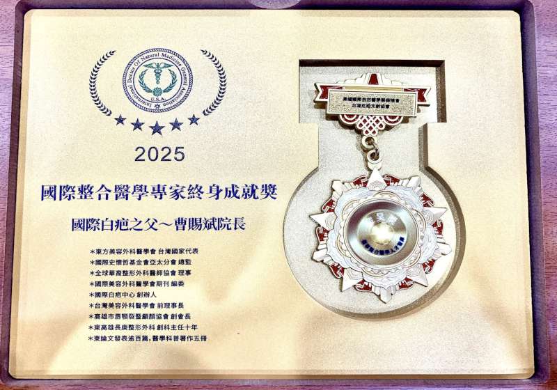 2025國際整合醫學高峰會議8月24日在台北舉行,會中國際白疤中心創辦人曹賜斌獲頒美國國際自然醫學醫師總會與美國Southeast De Paul大學國際整合醫學專家終生成就獎,接受美國大學代表Edward Little表揚,成為唯四得獎人。曹賜斌說,多年前發表獨創白疤顏色再生術治白疤 、除心疤,延續2023年國際史懷哲基金會史懷哲醫學與科學獎章,再獲國際醫學機構肯定,整形整心呼應史懷哲人道奉獻精神及國際整合醫學醫人醫心 全人醫治理念,感謝大會主席許心華力薦安排。圖/曹賜斌整形外科診所提供、文/高培德