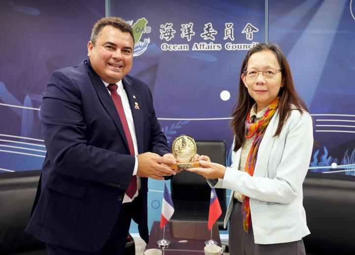 法國參議員羅夫齊(Teva ROHFRITSCH)(圖一左)領軍參議院暨法屬玻里尼西亞政要團8月28日拜會海洋委員會,致贈政務副主委黃向文(圖一右)台玻貝殼製作友誼紀念徽章,並商討海洋保育、教育與文化等議題。