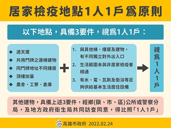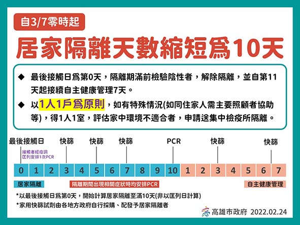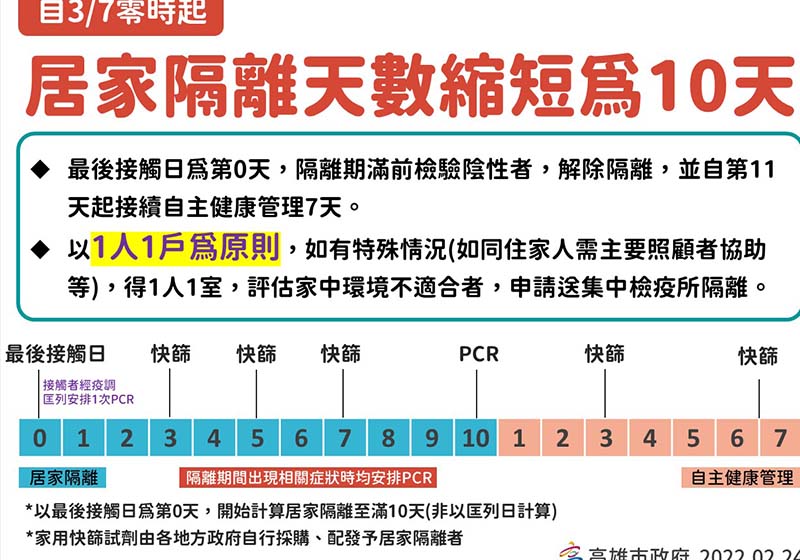 高雄市長陳其邁2月25日主持防疫會議,會中宣布根據中央流行疫情指揮中心統計,高市無新增新冠肺炎確診個案,3月7日起入境居家檢疫縮短為10天,並採一人一室原則,居格期滿後須自主健康管理7天,每間隔3天快篩一次。一人一室須符合透天厝、共用門牌連棟建築、同門牌地址不同樓層、頂樓加蓋、農舍、工寮、倉庫加獨立出入口、未和健康民眾共同生活、水、電、瓦斯、衛浴設備充足等條件。