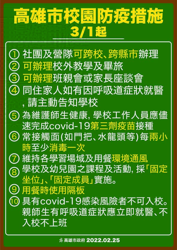 高市各級學校3月1日起開放社團及營隊跨校及跨縣市活動,辦理校外教學、畢旅、班親會、家長座談會、同住家人因呼吸道症狀就醫主動知會校方,鼓勵教職員盡速接種第三劑疫苗,門把、水龍頭等易接觸表面每2小時清消一次,教室及廚房等場域保持通風,各校及幼兒園課程及活動採固定成員及入座方式,用餐加裝隔板,親師生出現呼吸道症狀暫停到校並在家休息。