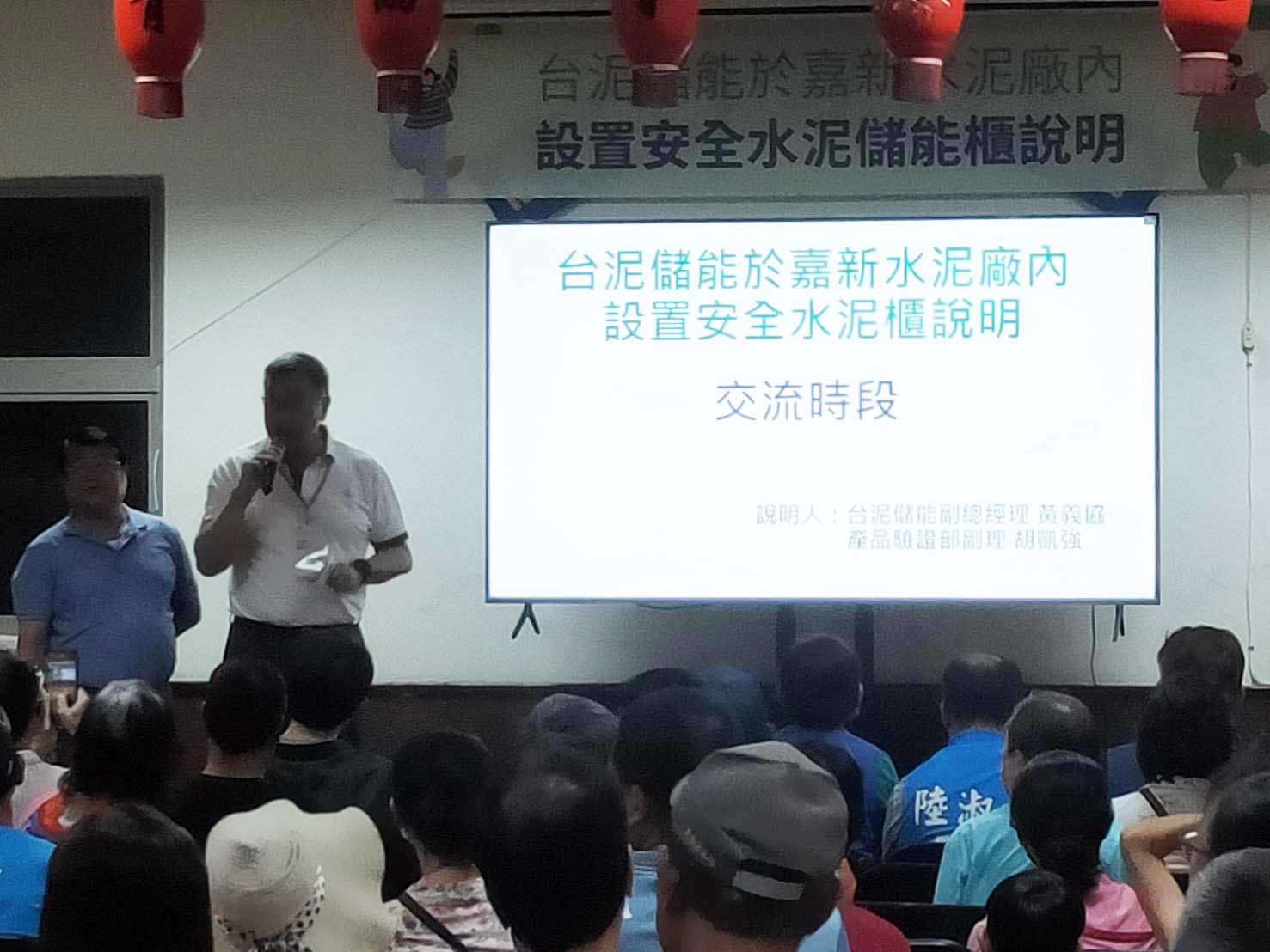 台泥規劃在高市岡山區竹圍里嘉新水泥廠舊址興建1座50百萬瓦(MW)儲能場,6月2日舉行說明會,採園遊會方式說明計畫案,並定時播放水泥式安全儲能介紹短片,現場還設計6道遊戲關卡,寓教於樂引導大小朋友了解能源科技發展現況,台泥表示,儲能場採用強度達台灣最高樓1.8倍水泥儲能櫃,兼具防火效果。