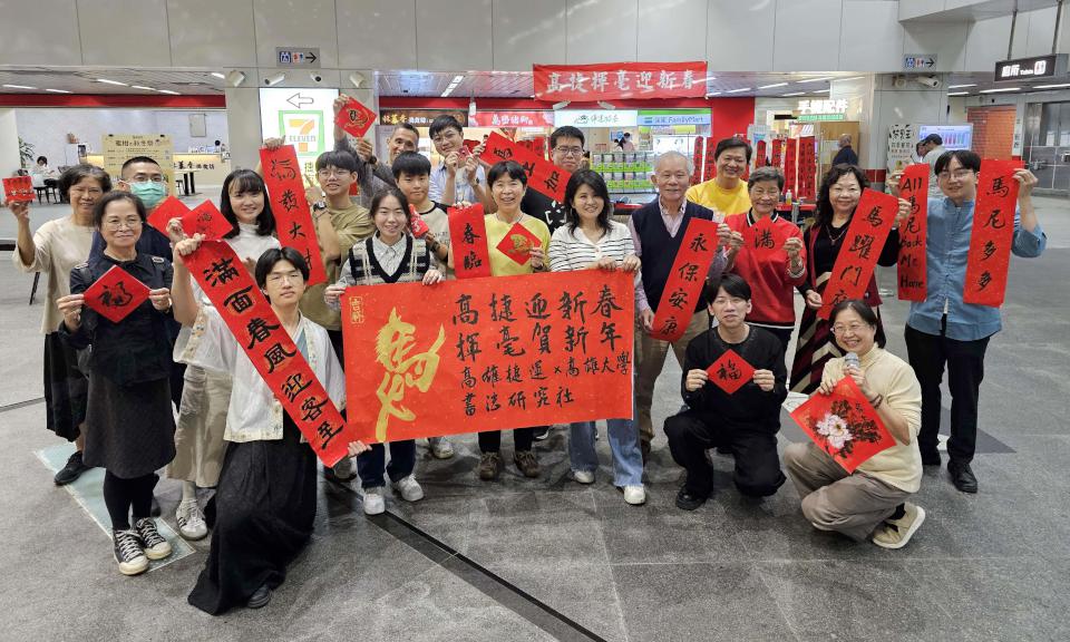 國立高雄大學學務處「揮毫贈春聯」系列活動2月6日至8日在高雄捷運左營站、梓官區蚵子寮通安宮、楠梓區藍田里仁壽宮等地接力舉行,書法名家宋耀偉與高大書法研究社師生現場揮毫七字對聯、四言吉語及單字吉語免費贈送,宋耀偉寫下「高大騰捷」,象徵高大與高捷如萬馬奔騰攜手前行,高大學務長王明月說,活動攜手高捷邁入第12 年,傳承書法藝術文化,也引導學生體驗服務學習。
