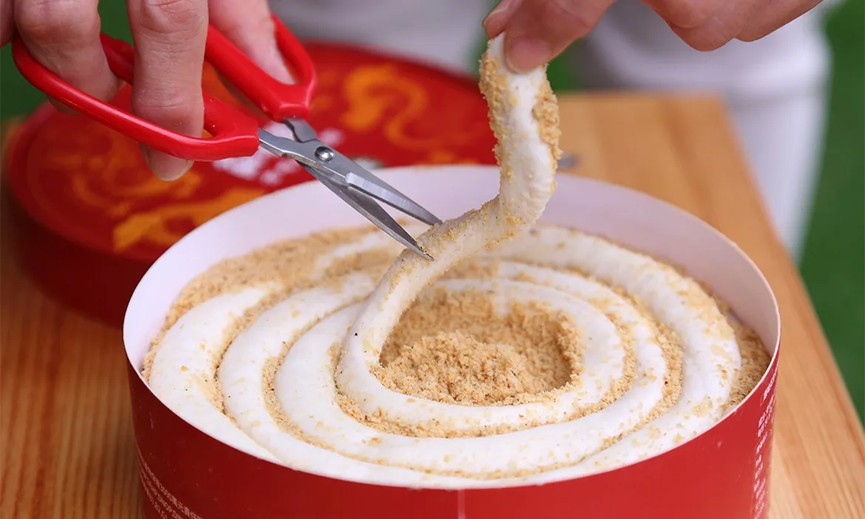 蘇老爺花生麥芽糖外觀是討喜的圓圈圈,禮盒內貼心附上一把小紅剪刀 。