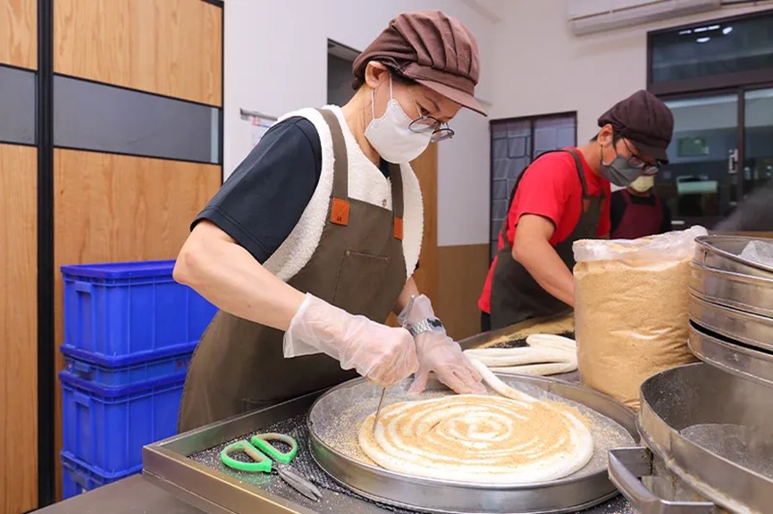 踏進門市後方的工作區,大鍋正在熬煮麥芽糖膏。蘇禾豐解釋道,由於每批食材原料品質略有不同,所以烹煮過程的第一步必須先調整糖膏的含水比。他們會觀察鍋裡糖膏的流速,以此判斷是否繼續加熱。當流速達到標準時,再倒入小盆內,讓其冷卻成可塑形的柔軟琥珀色糖膏。接著將糖膏放入機器中反覆拉扯,使空氣混入其中,經過約6到8分鐘,糖膏逐漸轉變為銀白色麥芽糖塊,手工擀平再鋪上餡料,搓拉成長條狀後置入盒中,一盒盒精緻可愛的麥芽糖就此誕生,令人垂涎三尺。(延伸閱讀:古早味麥芽糖,回憶裡的酸甜難以忘懷)