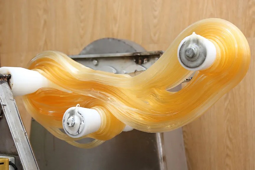 麥芽糖經過機器反覆拉扯的過程,因混入大量空氣會逐漸變成銀白色。