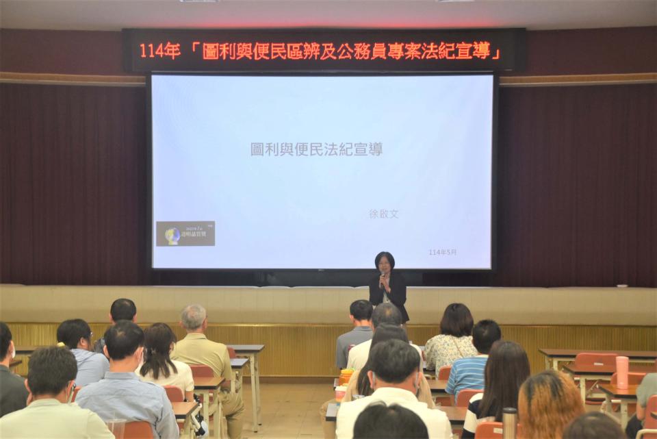 財政部關務署高雄關5月28日辦理圖利與便民區辨及公務員專案法紀宣導講習,邀請財政部關務署政風室主任徐啟文分享實務經驗與法規重點,過程穿插反詐宣導,提醒與會人員如接獲不明來電、簡訊慎防個資外洩,維護自身權益。圖/高雄關提供、文/高培德