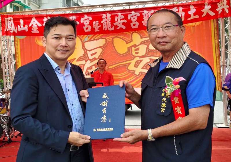 高雄鳳山金龍太子宮暨龍安宮10月19日舉行新廟動土大典,主委劉人豪(圖一右)捐贈社教館更新修繕設施經費,館長黃昭誌(圖一左)代表接受並回贈感謝狀,劉人豪說,社教館提供市民休閒遊憩場域,提升文化素養、公民意識、家庭教育及藝文欣賞風氣,配合新廟動土捐贈善款,期能改善場館年久失修情況,提供民眾優質舒適活動場域。黃昭誌說,感謝廟方慷慨解囊,相信社會公益及穩定力量奠基慎終追遠、承先啟後精神。圖/社教館提供、文/高培德