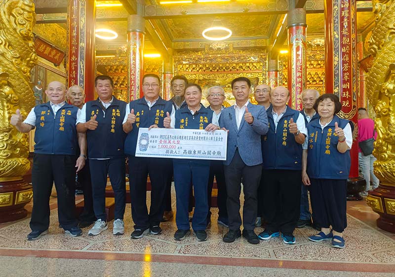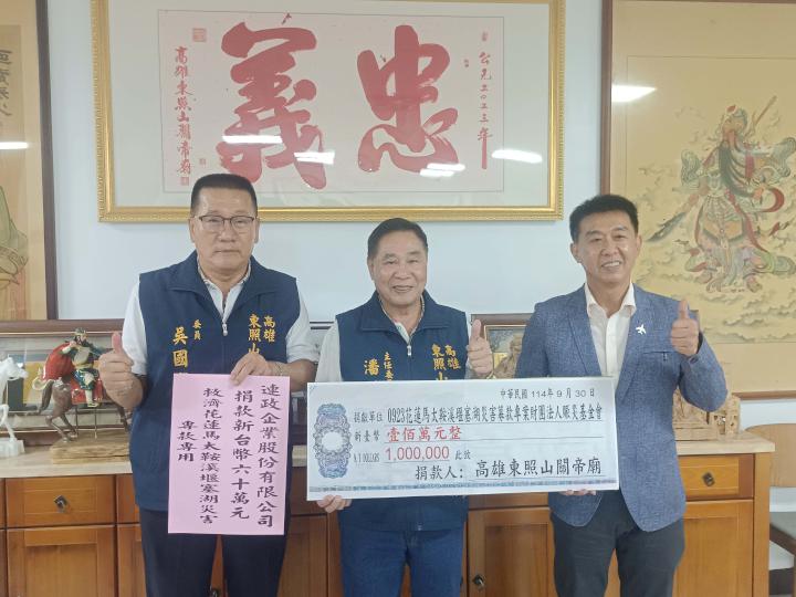 受9月23日強颱樺加沙外圍環流影響,花蓮縣馬太鞍溪堰塞湖溢流淹沒光復鄉,造成至少18人不幸罹難、157人受傷、6人失聯,高雄東照山關帝廟管理委員會及信徒自組團隊協助受災戶清理家園,主委潘献有(圖一中)10月5日代表捐資100萬元挹注0923花蓮馬太鞍溪堰塞湖災害募款專案,委員、連政企業董事長吳國寶(圖一左)也當場加碼60萬元,中華國際儒教會理事長、立委許智傑(圖一右)等人歡喜見證。
