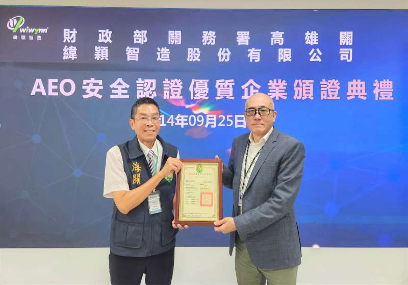 緯穎智造通過安全認證優質企業(AEO)認證,財政部關務署高雄關副關務長王明仁9月25日授證總經理丁英斌表達祝賀。圖/高雄關提供、文/高培德