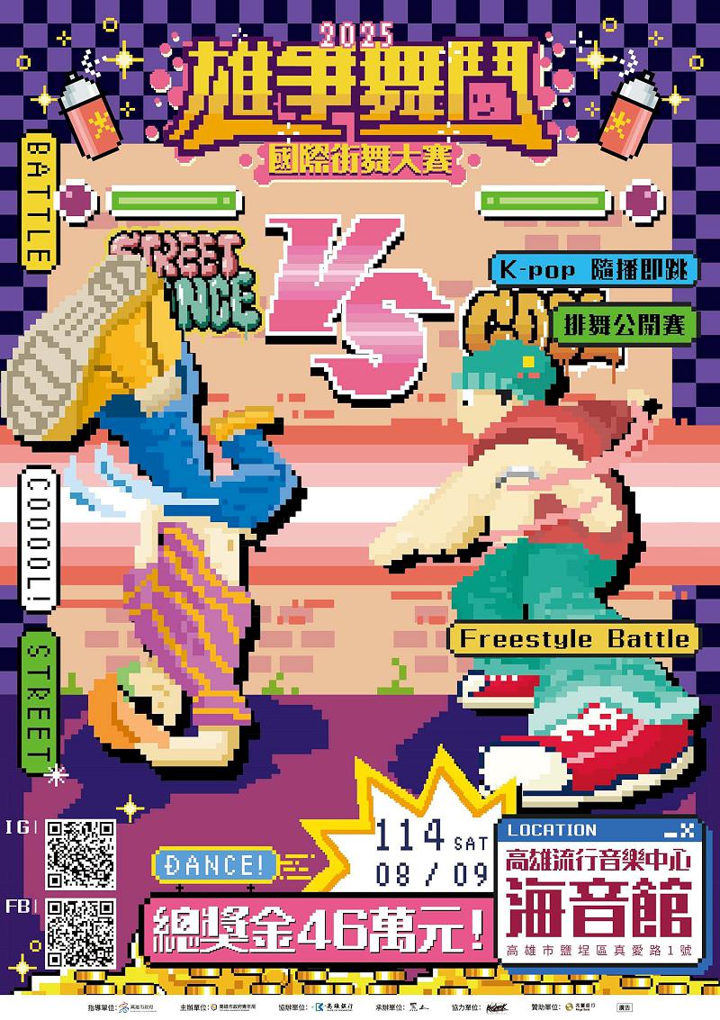 高市青年局812國際青年日系列活動2025年第五屆雄爭舞鬥國際街舞大賽8月9日在高雄流行音樂中心海音館舉行,總獎金46萬元,預估吸引超過500名國內外街舞好手角逐排舞賽、Freestyle Battle與K-POP即播即跳三大賽事,青年局長林楷軒說,街舞賽提前暑假舉行,營造兼具競技、潮流及文化國際舞台,還首度新增結合街頭塗鴉、潮流選物等元素街頭文化體驗區,感受街頭藝術多元魅力。