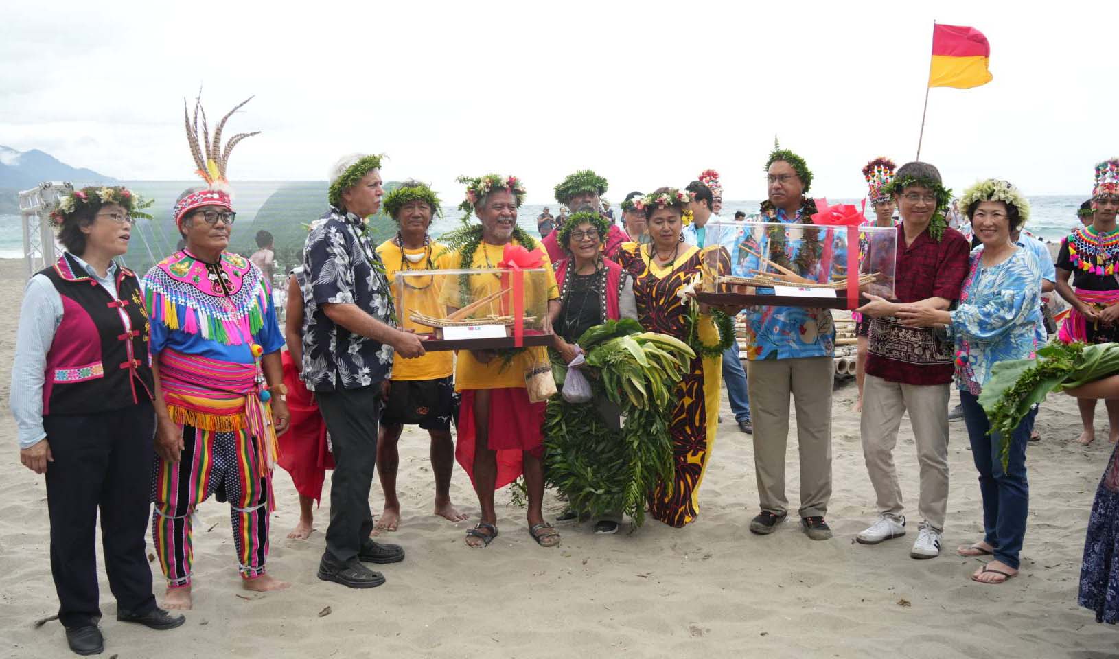 帛琉無私分享號航行20天1340海浬5月10日首抵台台東縣蘭嶼鄉,海洋委員會、中央原民會、台東縣府與部落原民齊聚莿桐部落海洋學習基地歡喜迎賓,書寫海委會復振航海文化力計畫,串連公私單位力推海洋文化新里程碑,台東縣長饒慶鈴致贈船長船舶模型,帛琉也回贈傳統故事板。