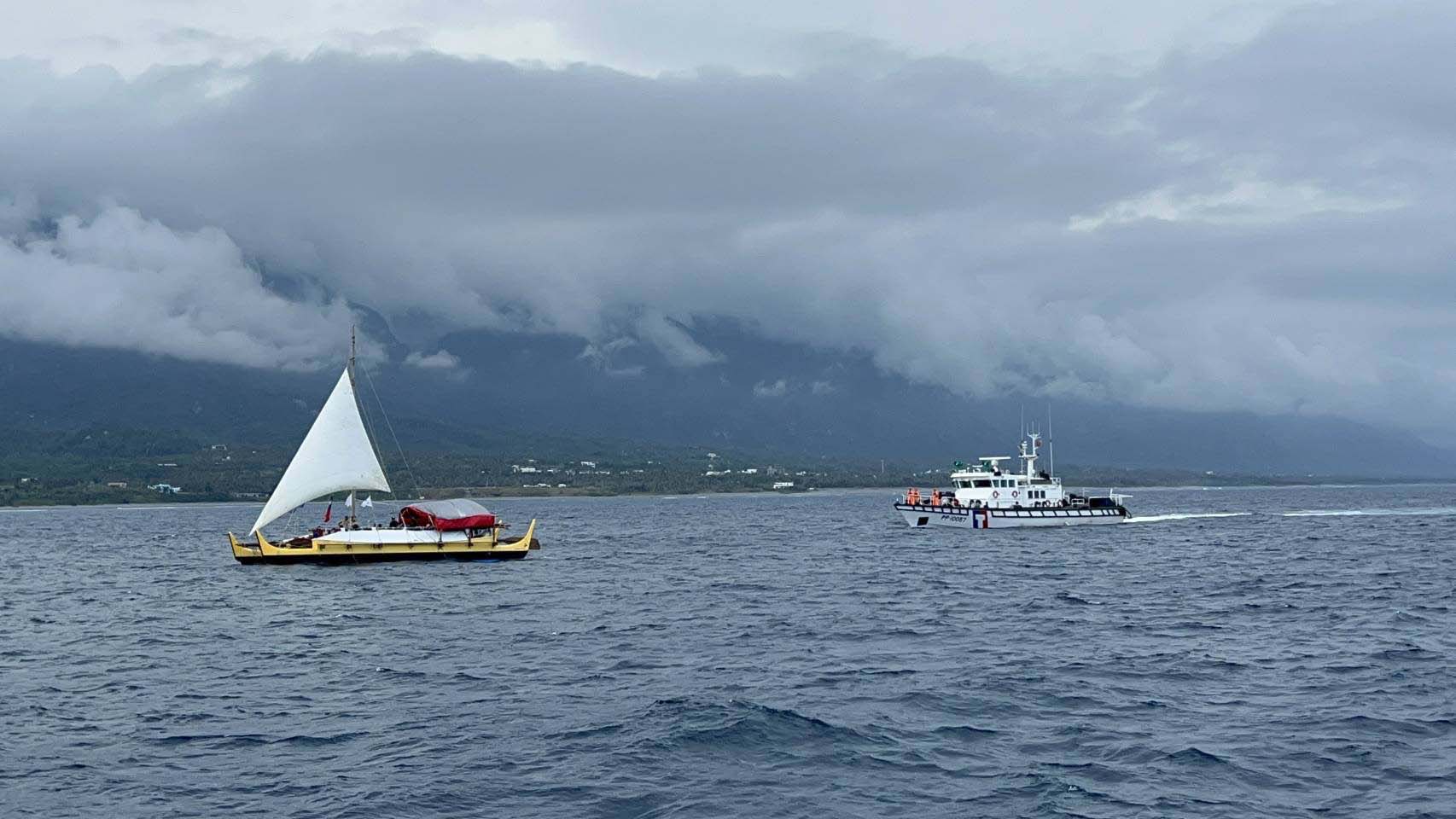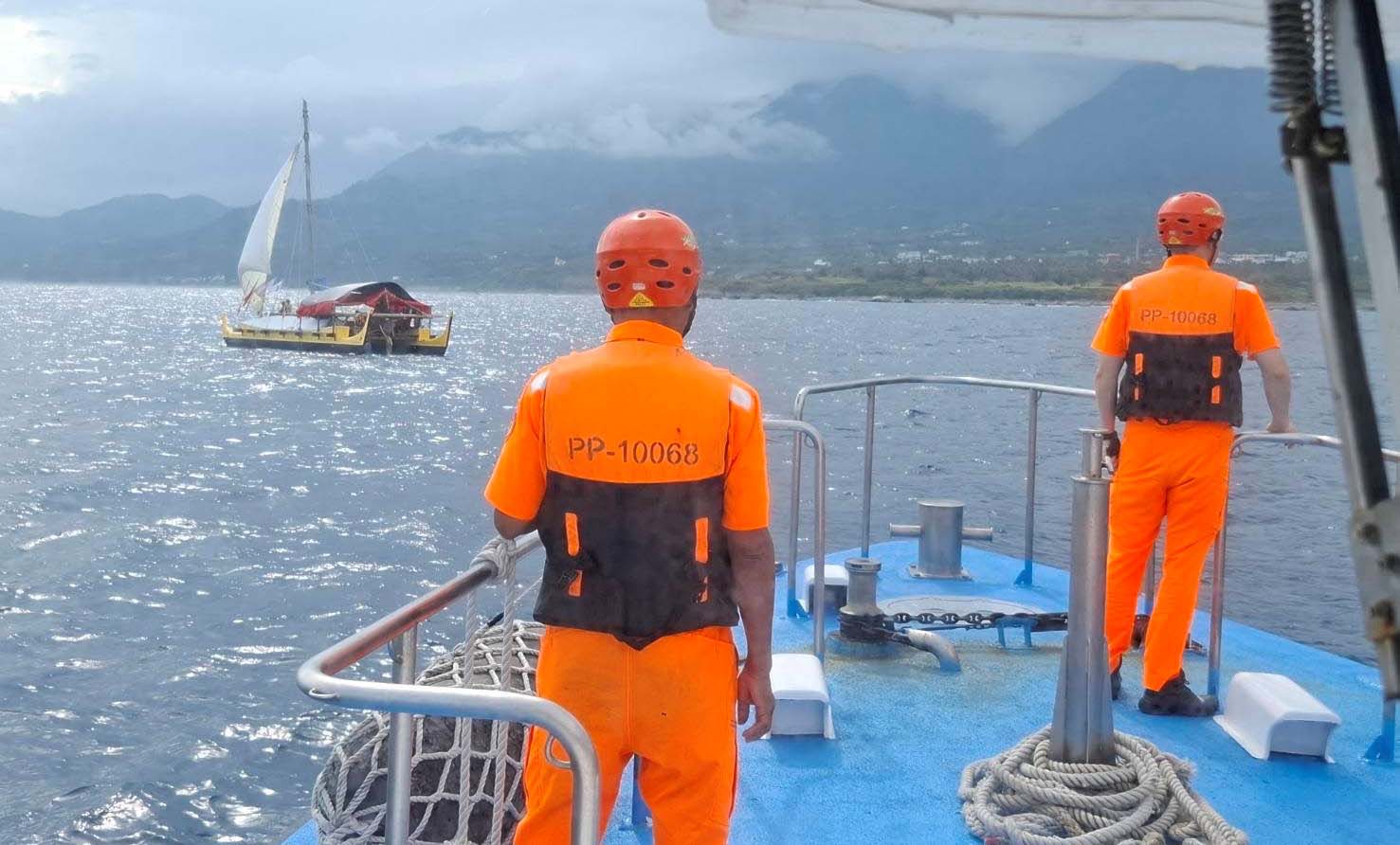 無私分享號停留蘭嶼3天2夜文化交流,5月10日凌晨啟航朝台東阿美族莿桐部落海洋學習基地出發,海巡署東部分署第13岸巡隊及第15海巡隊31人全程戒護。東海岸部落族人列隊傳統儀式、吟唱及舞蹈迎賓祈福。