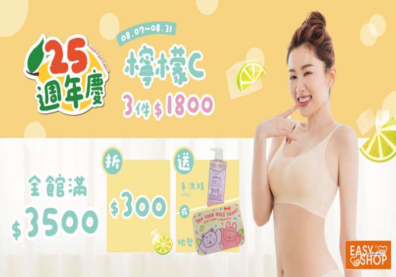 國民內衣品牌EASY SHOP迎來25歲生日,週年慶於即日起至8/31(日),在全台門市、官方網站及各大電商平台歡樂開跑!EASY SHOP 25週年慶獨家巨獻煎妮花聯名第二彈「檸檬維C」舒適系列、還有「Audrey柔曲」等多款指定商品買一送一。活動期間單筆消費滿3500元,除了現折300,折扣後滿額還加碼贈送煎妮花聯名手洗精或可愛爆棚地墊,數量有限,送完為止。
