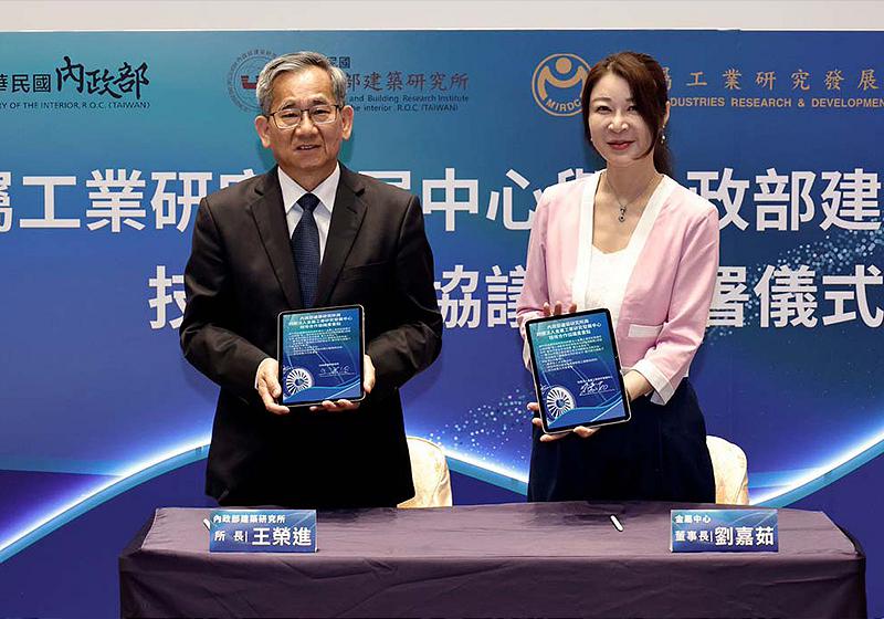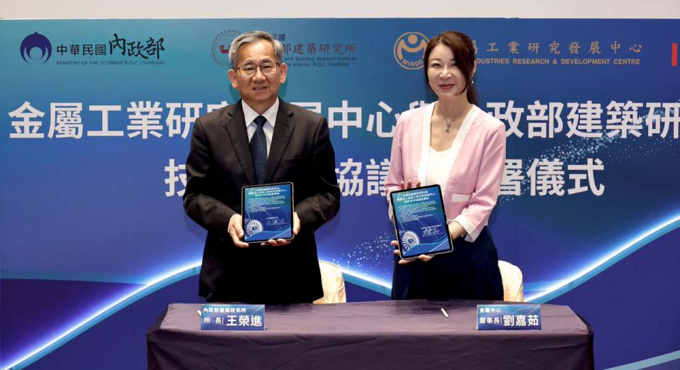 財團法人金屬工業研究發展中心董事長劉嘉茹(圖右)9月8日與內政部建築研究所所長王榮進(圖左)簽署合作備忘錄(MOU),宣示借重雙方無人機研發技術與風雨風洞實驗設施優勢,應用地震後建築巡檢、火災後熱點偵測、高風險環境設備巡檢等作業,強化災害應變量能。