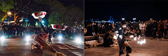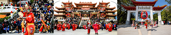 ▲蓮潭燈會邀請高雄地嶽殿吉勝堂八家將、舊城十二婆姐陣和廟埕藝陣展演〈由左至右〉