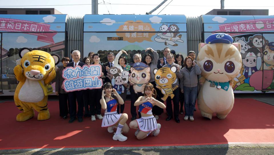 高雄捷運董事長楊岳崑、台灣虎航董事長黃世惠、日本岡山縣副知事尾崎祐子等人啟動舞台道具,宣布「虎力全開・雄遊岡山」台日三方旅遊彩繪輕軌首航活動起跑,高捷攜手虎航與日本岡山縣旅遊彩繪輕軌列車,融入高捷貓站長蜜柑、虎航虎將及岡山桃太郎君等吉祥物圖像,1月23日至2月22日運行輕軌沿線,陪伴旅客共度通勤時光。