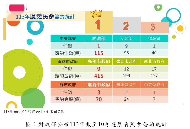 財政部11月26日公布113年度促進民間參與公共建設業務考核成績,高市獲評特優,財政局感謝評委肯定及同仁努力。高市促參推動委員會召集人、副市長林欽榮說,根據財政部統計,截至113年10月,高市經認列民間投資金額達415億元,排名全台首位,其中財政局辦理高市左營高鐵科技之心第三種商業區A、B土地公辦都市更新案認列民間投資金額154億元獨步全台。財政局長陳勇勝說,此次主要考核112年,感謝相關局處努力,完成「捷運橘線O10站聯合開發案」、「捷運黃線Y15站聯合開發案」等6案招商簽約,113年民間投資金額預估達900億元,超越111年708億元創新高。圖/財政局提供、文/高培德