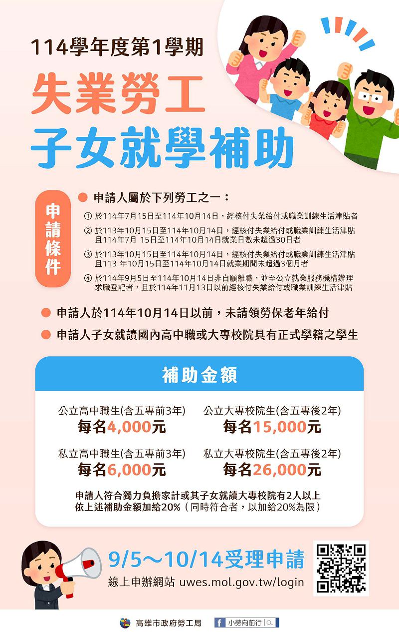 114學年度第1學期失業勞工子女就學補助即日起至10月14日受理114年10月14日前非自願離職失業勞工、未請領老年給付且114年7月15日至10月14日領取失業給付、職業訓練生活津貼者、113年10月15日至114年10月14日領取失業給付或職業訓練生活津貼、114年7月15日至10月14日就業未滿30日、113年10月15日至114年10月14日請領失業給付、職訓生活津貼且113年10月15日至114年10月14日就業未滿3個月者、114年9月5日至114年10月14日非自願離職,並經公立就業服務機構登記求職且114年11月13日前請領失業給付及職訓生活津貼等對象郵寄及上網申請,補助簡章及申請表可至高市勞工局1樓服務台、訓練就業中心各就業服務站台、區公所索取或上勞工局及勞動部官網下載。