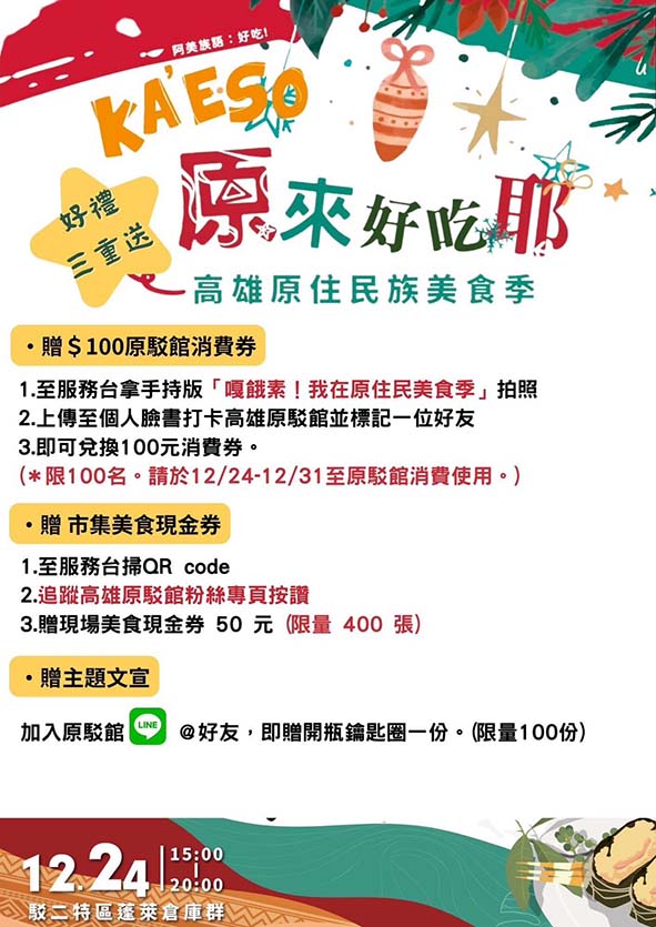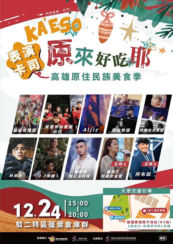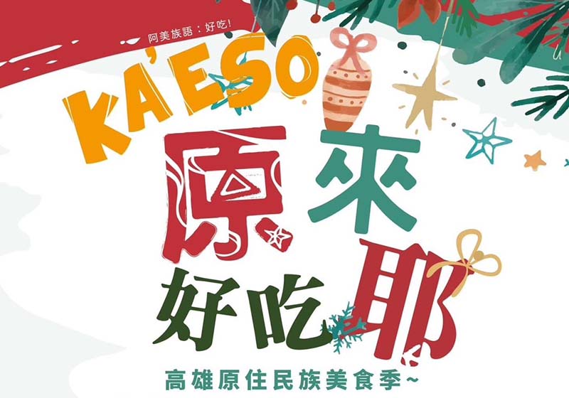 高雄市原民會主委阿布斯表示,為推廣高雄在地原住民特色美食, 今年於駁二藝術特區蓬萊倉庫群辦理原住民族美食季的活動,特定用阿美族語「好吃」KA’ESO為標語,召集30家在地美食店家齊聚辦理原味市集,主打高雄原住民最好吃的就在這裡。推廣原住民族飲食文化,讓社會大眾對原民傳統食材,有更多的認識了解,來KA'ESO原來還好吃耶,除了享受原民美食外,還能聽聽原民歌手帶來的精彩表演,一起度過美好的平安夜。更多詳情請洽:高雄市原住民事務委員會https://www.facebook.com/khhindigenous/