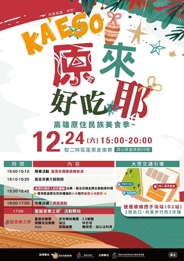 12月24日下午三點將於駁二藝術特區蓬萊倉庫舉辦「KA’ESO原來好吃耶高雄原住民族美食季」與大家一起共度平安夜,活動邀請原住民國際金牌主廚-谷桑‧路法尼耀,運用在地農特產小米、部落食蔬及石板烤肉,進行創意料理示範,此外現場還有原味市集、原音之夜、金牌料理品嚐等眾多精彩活動,透過美食、音樂將帶給您不同的聖誕之夜。