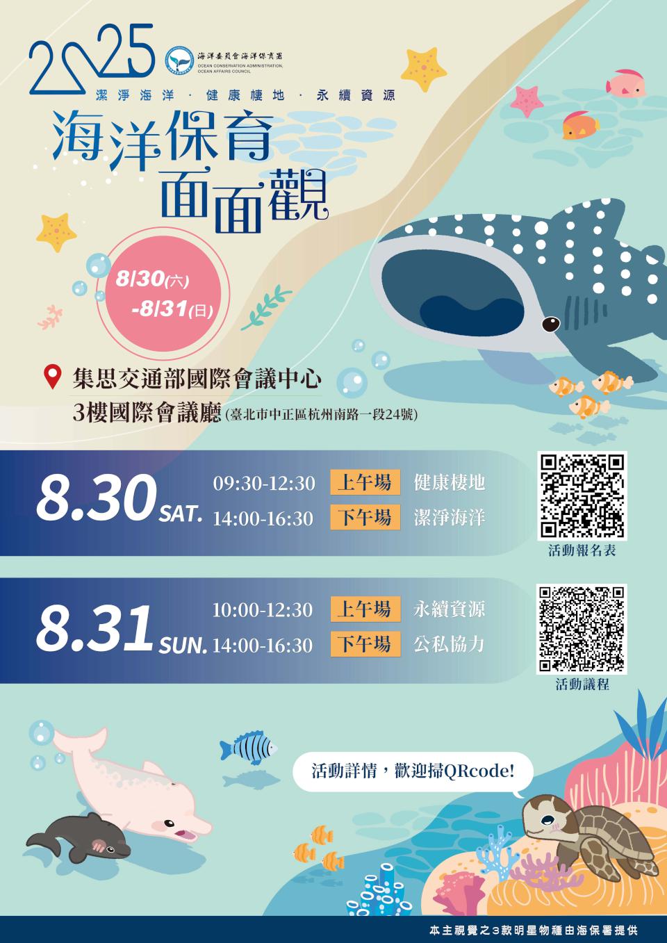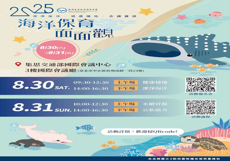 海洋委員會海洋保育署「2025海洋保育面面觀」研討會8月30日至31日在交通部臺北集思國際會議中心舉行,聚焦海洋保護區發展、海域污染治理、珊瑚與海草復育、保育教育推廣、公民參與等議題,歡迎民眾報名參與,海保署官方社群全程直播。