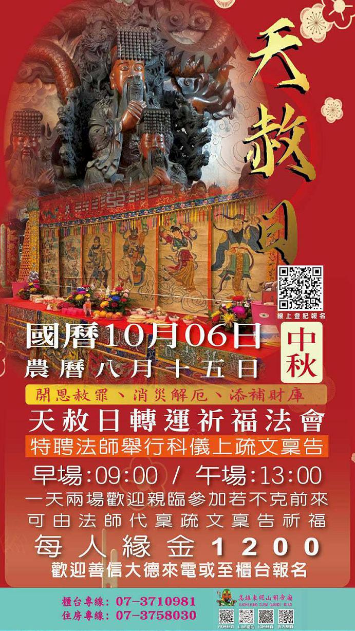 114年10月6日天赦日適逢中秋節,高雄東照山關帝廟上午9點及下午1點擴大辦理轉運祈福法會,邀請信眾香客參拜迎福、改運、納財,主委潘献有說,法會結合中秋團圓氛圍,增添祈福吉祥能量,錯過10月6日把握12月21日最後天赦日機會。