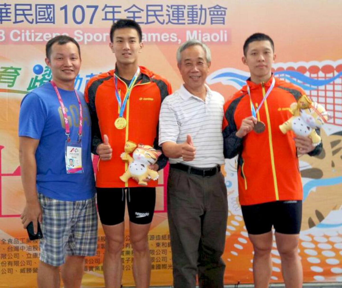 高市政運動發展局代理局長周明鎮(右二)、水上救生男子組200公尺障礙游泳金牌選手安廷耀(左二)、銅牌選手王郁濂(右一)及領隊許衛銘(左一)合影留念。
