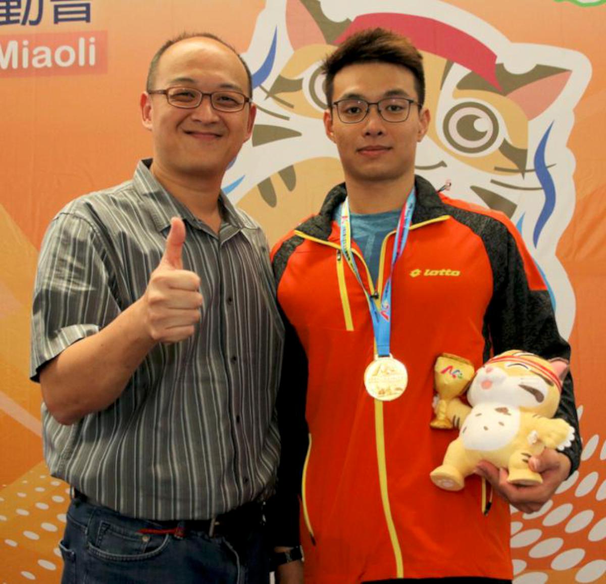 高市代表隊選手林建龍(右)在男組蹼泳及水上救生包辦1金2銀2銅,與運發局主秘藍偉仁(左)開心合影。圖/運發局提供