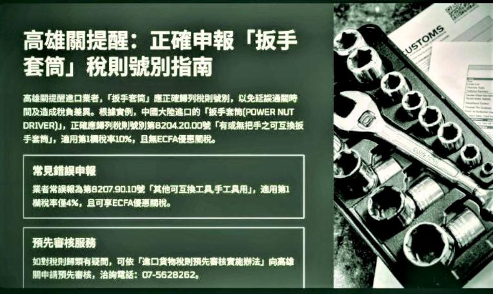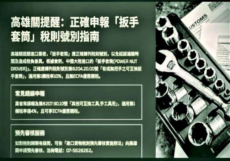 高雄關提醒正確申報扳手套筒貨品稅則號別 便利貨物快速通關