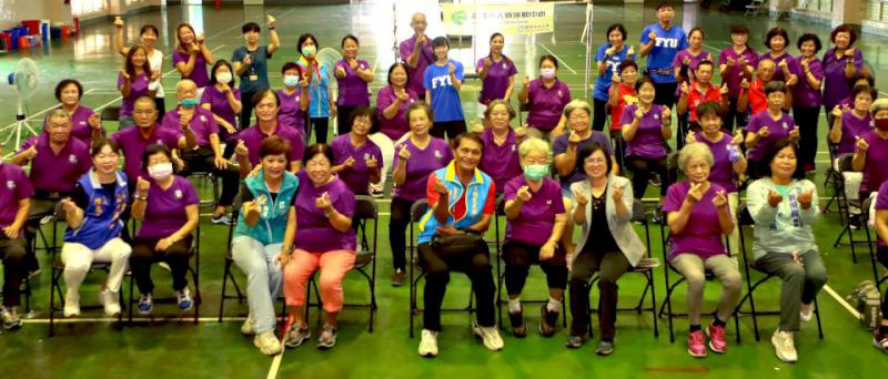 高市大寮運動中心10月2日在大樹區綜合體育館辦理「社區樂齡活動•乎你筋骨更勇」運動健康公益活動,輔英科技大學教練領軍社區長者享受揮汗樂趣,運動發展局專委汪小芬、輔英科大體育暨健康促進中心主任蔡芬卿、大樹區九曲里里長潘德勝等人到場參與,號召銀髮族養成規律運動習慣,健康呷百二。