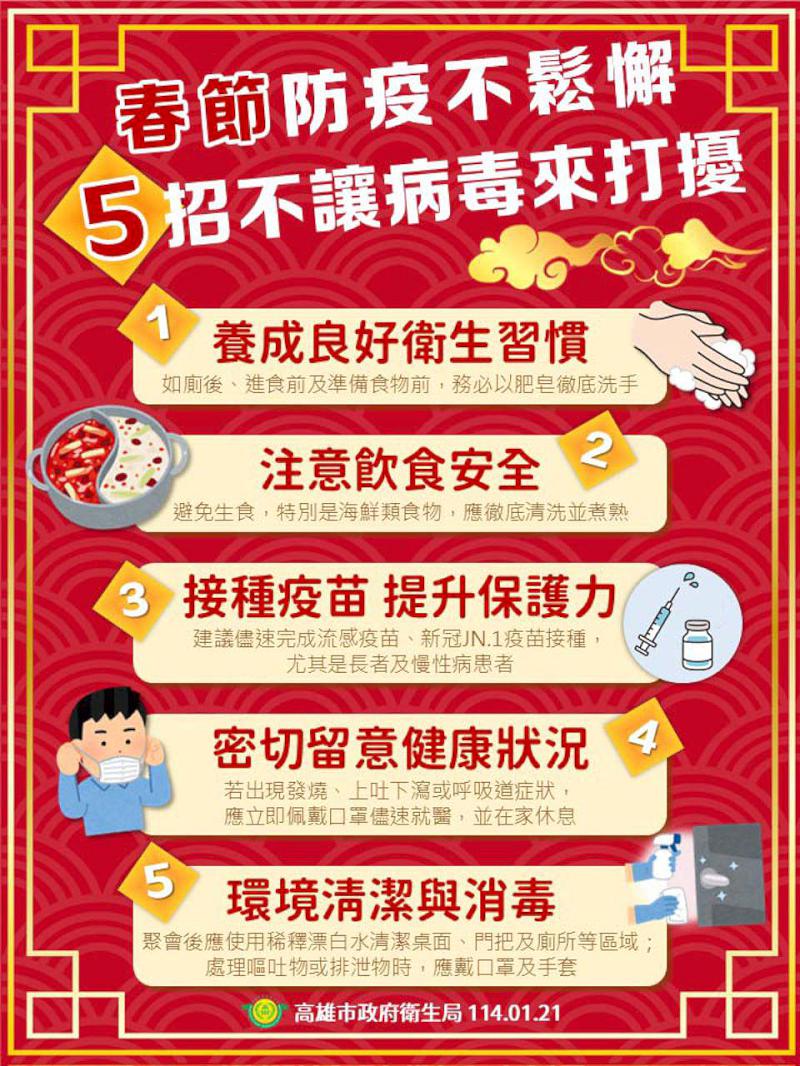 根據疾管署監測資料顯示,114年1月12日至18日類流感急診就診率全國12.38%、高市12.72%,超過平均值11%,另流感併發重症確診全國141例(死亡13例)、高市17例(死亡零例),其中滿65歲占52.9%,逾7成具慢性病史,逾8成未接中流感疫苗,腹瀉全國急診就診率8.76%、高市7.85%,創5年新高,根據統計,截至1月20日,公費流感疫苗剩24000劑,提醒接種疫苗滿2週才能產生抗體,盡速施打提升防護力。更多防疫資訊可上衛生局官網查詢或電洽防疫專線1922、0800-001-922、(07)7230250。圖/衛生局提供、文/高培德
