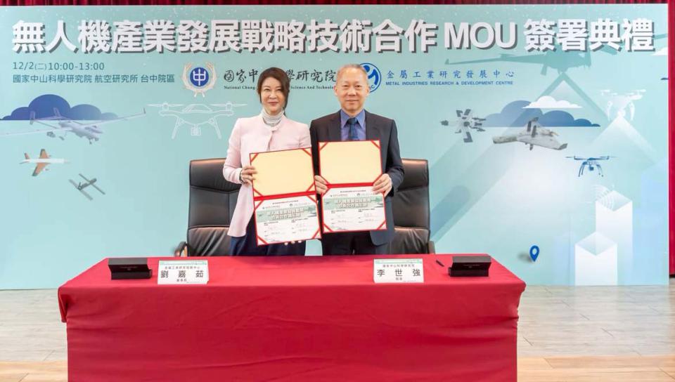 財團法人金屬工業研究發展中心董事長劉嘉茹(圖左)12月2日與國家中山科學研究院院長李世強(圖右)簽署無人機產業發展戰略技術合作備忘錄(MOU),宣示攜手整合研發能量及產業資源,推動國產無人機研製應用,強化自主國防能力,助攻產業國際競爭力。