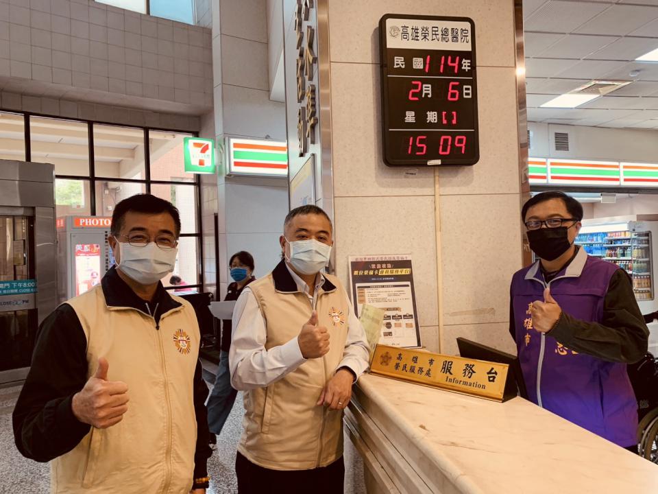 ▲高雄市榮民服務處副處長張詠駿(中間)、服務組組長謝仲雄(左)至服務台關心社區組長駐點服務情形
