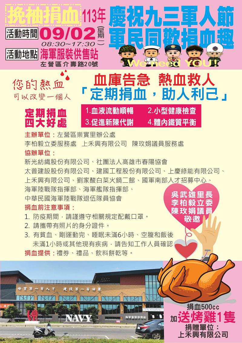 高市左營區崇實里辦公處、立委李柏毅服務處、高市議員陳玫娟服務處、上禾興、國軍南部人才招募中心等協辦捐血活動9月2日上午8點30分至下午5點30分在海軍服裝供售站(高市左營區介壽路20號)舉行,捐血500cc者可獲禮券、禮品及飲料、餅乾、烤雞一隻。圖/左營區崇實里辦公處提供、文/高培德