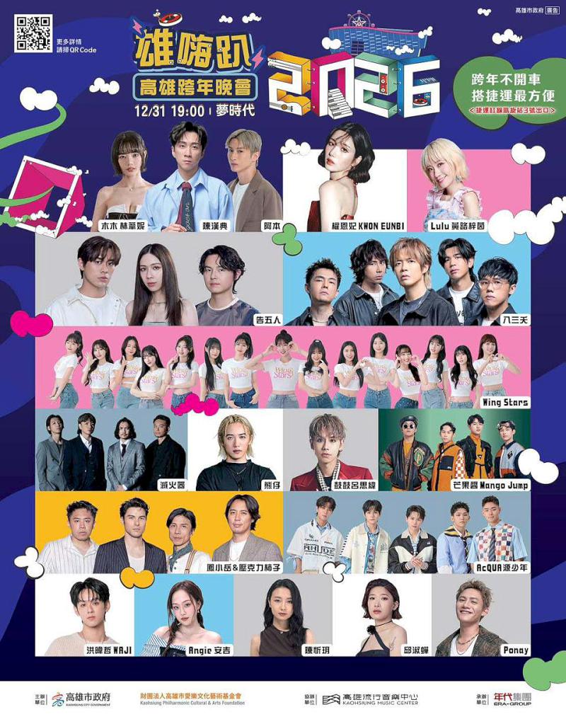 高市府2026雄嗨趴跨年晚會12月31日晚上7點在前鎮區時代大道舉行,陳漢典、金鐘紅毯主持木木林葦妮、阿本聯袂主持,並集結Lulu黃路梓茵、告五人、八三夭、鳳小岳&壓克力柿子、熊仔、滅火器、芒果醬 Mango Jump、陳忻玥、鼓鼓 呂思緯、邱淑蟬、洪暐哲、AcQUA 源少年、Wing Stars、Ponay的原式大樂隊、Angie安吉等海內外17組夢幻卡司,還獨家力邀韓國水彈女王(Waterbomb)權恩妃(KWON EUNBI)開唱,中華職棒台鋼雄鷹Wing Stars啦啦隊12月29日彩排展現青春活力,宣告全力備戰活動。