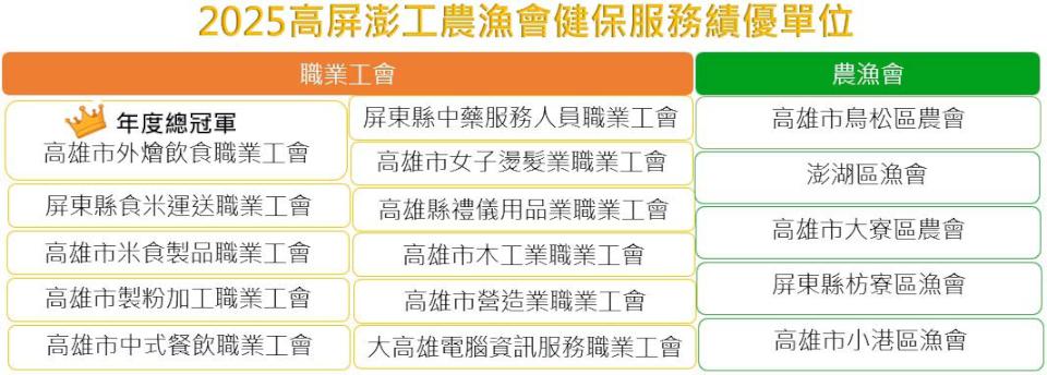 中央健康保險署高屏業務組10月17日表揚114年高雄、屏東、澎湖等地16家工、農、漁會績優投保單位,其中高市外燴飲食職業工會強化網路申報,並鼓勵會員下載健保快易通APP、加入健保署官方社群及辦理虛擬健保卡等勇奪總冠軍,另高市鳥松區農會與屏東縣中藥服務工會連續8年獲得肯定。澎湖縣黃姓男子從事旅遊業,因女兒工讀無離職證明未能加入健保,經工會承辦人透過健保署多憑證網路承保作業系統,查詢任職單位轉出日並辦理線上加保及明細證明省時便利。