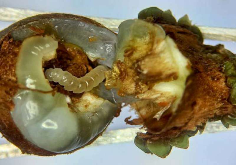 荔枝細蛾別名荔枝蒂蛀蛾、蒂頭蟲、南風蟲,幼蟲鑽入新芽、葉脈及葉肉覓食,造成新芽嫩葉枯死,成蟲可產卵果實表皮,幼蟲孵化後直接叮咬果肉,造成果實落地,影響產量及賣相。