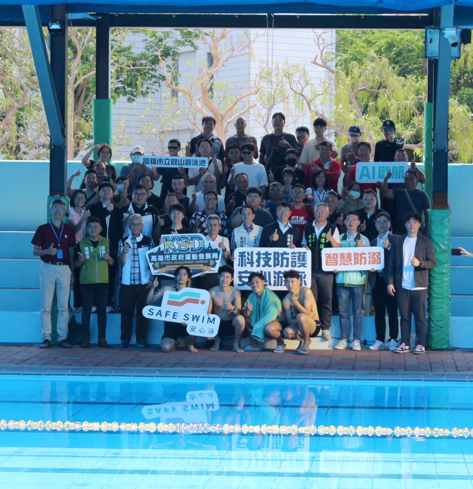 高市運動發展局攜手富據智能科技領先全台導入人工智慧科技,建置水上、水下智慧泳池安全監測輔助系統進駐高市鼓山游泳池4月23日啟用,運發局長侯尊堯、富據智能科技執行長陳靖儒、工業研究院中分院設計創新組長黃天佑、大榮中學董事長李振登、內惟國小校長林家任、內惟國小游泳隊教練、國立成功大學體育健康與休閒研究所教授黃滄海、台灣游泳池事業協會理事長范清樂、高雄水上救生協會總幹事楊忠穎、台灣游泳池事業協會秘書長劉家豪、丸鐵運動訓練中心總經理郭修森、台中南屯國民運動中心執行長茆逸榮、市議員李喬如等人見證誌慶,侯尊堯說,鼓山泳池作為試辦場域,守護使用者安全,未來逐步推廣至其他地區,強化公共安全。
