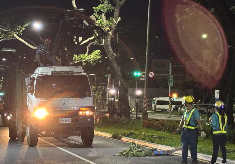 樹倒影響輕軌列車通行,高捷成立緊急應變中心,續調派人力及大型機具搶通,同時變更輕軌運轉模式調度列車,移除阻礙物後巡檢軌道,恢復正常營運。圖/捷運局提供、文/高培德