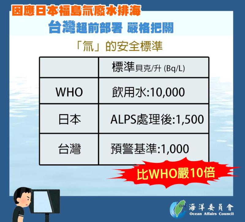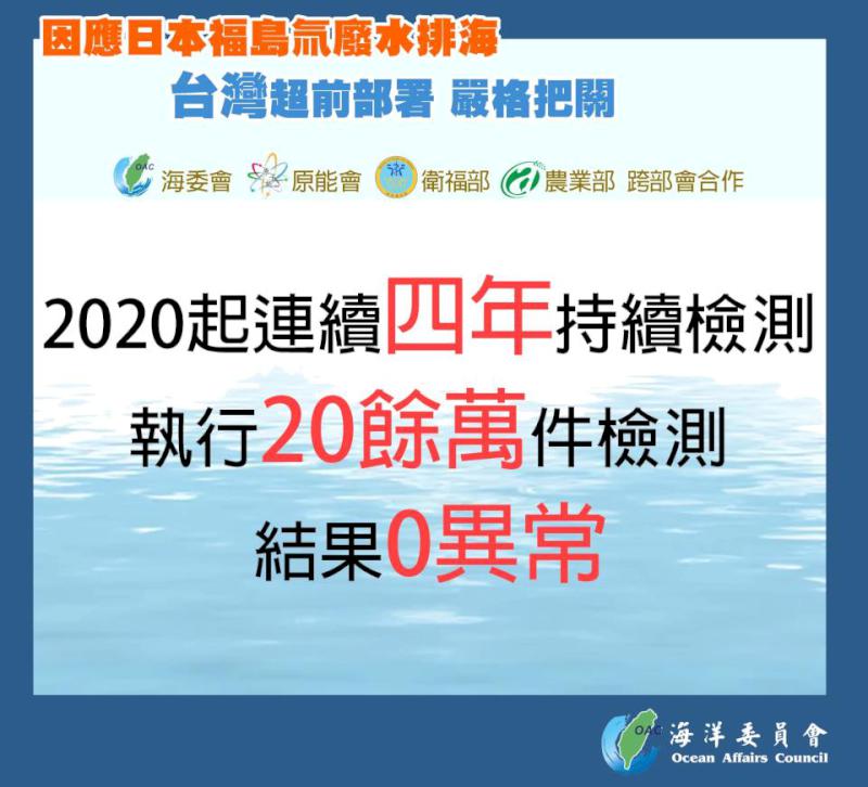海委會表示,原子能委員會、海委會科技文教處、海巡署、國家海洋研究院、海洋保育署、衛生福利部、農業部等合組跨部會合作平台,擴大檢測海水、漁產、日本進口食品、環境生態樣本等,截至112年採樣逾20萬件,結果未發現異常。