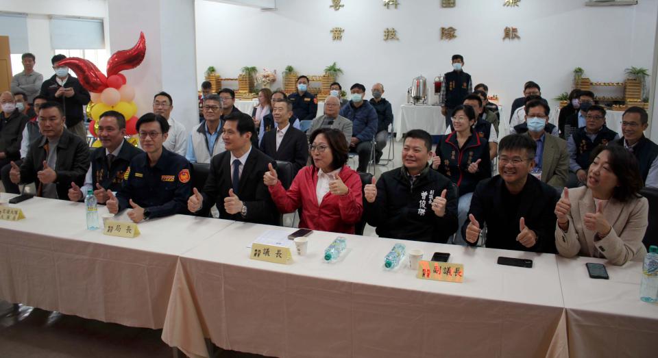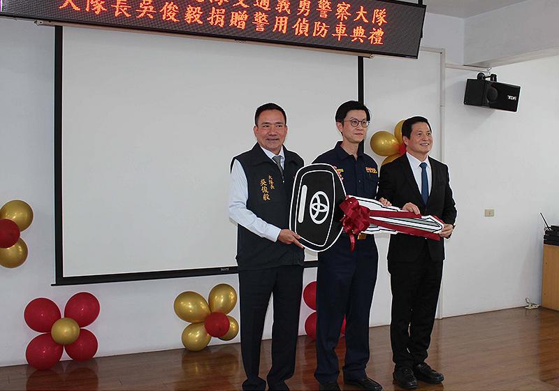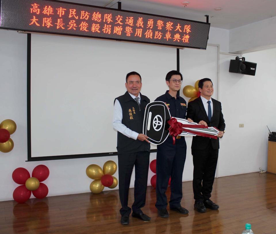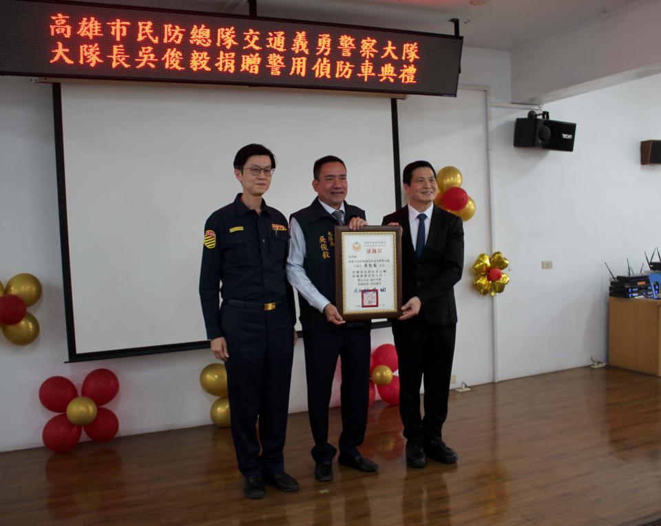 在前金區長許淑媛、高市議會議長康裕成、副議長曾俊傑、市議員李雅芬、張勝富等人見證下,高市警察局長林炎田(圖一右)、交通警察大隊大隊長黃元民(圖一中)2月6日從民防總隊交通義勇警察大隊大隊長吳俊毅(圖一左)手中接過道具鑰匙及模型車,歡喜受贈偵防車一輛並回贈感謝狀,吳俊毅說,義交協勤各項重大工程及活動交通維護,期盼日本原裝進口偵防車有助強化執勤安全及量能。