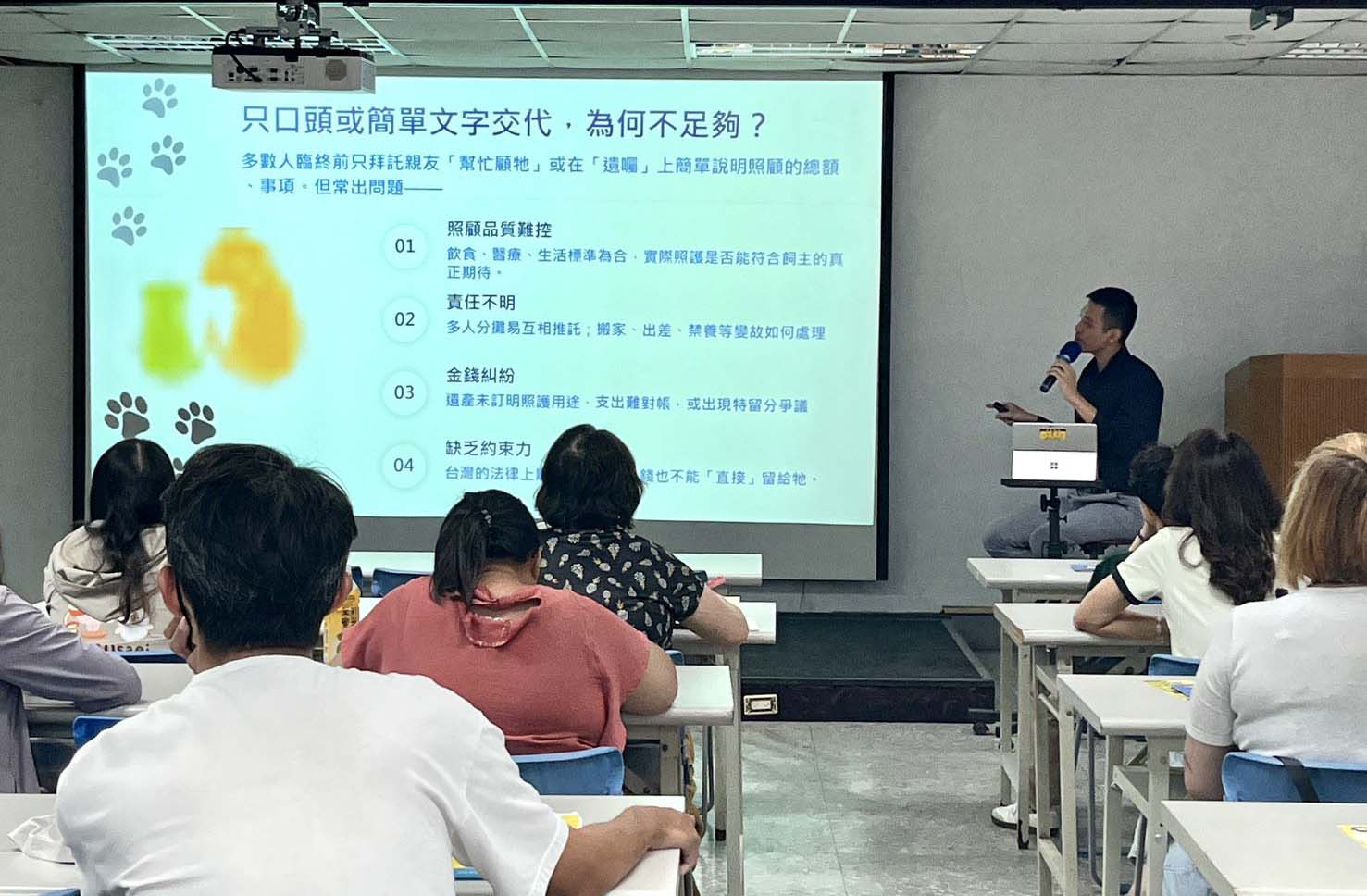 高市農業局動物保護處於世界動物日10月4日辦理「好伴講座-誰能照顧留下的牠?」,邀請律師謝騏安舉例美國、日本寵物信託制度,從生活與法律角度切入,聚焦「未來照顧人選安排」、「寵物遺產與遺囑法律運用」、「如何選擇合適託管人」等主題,探討飼主預先安排照顧毛孩事宜。